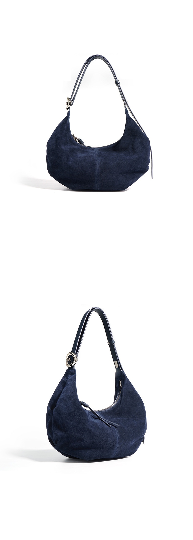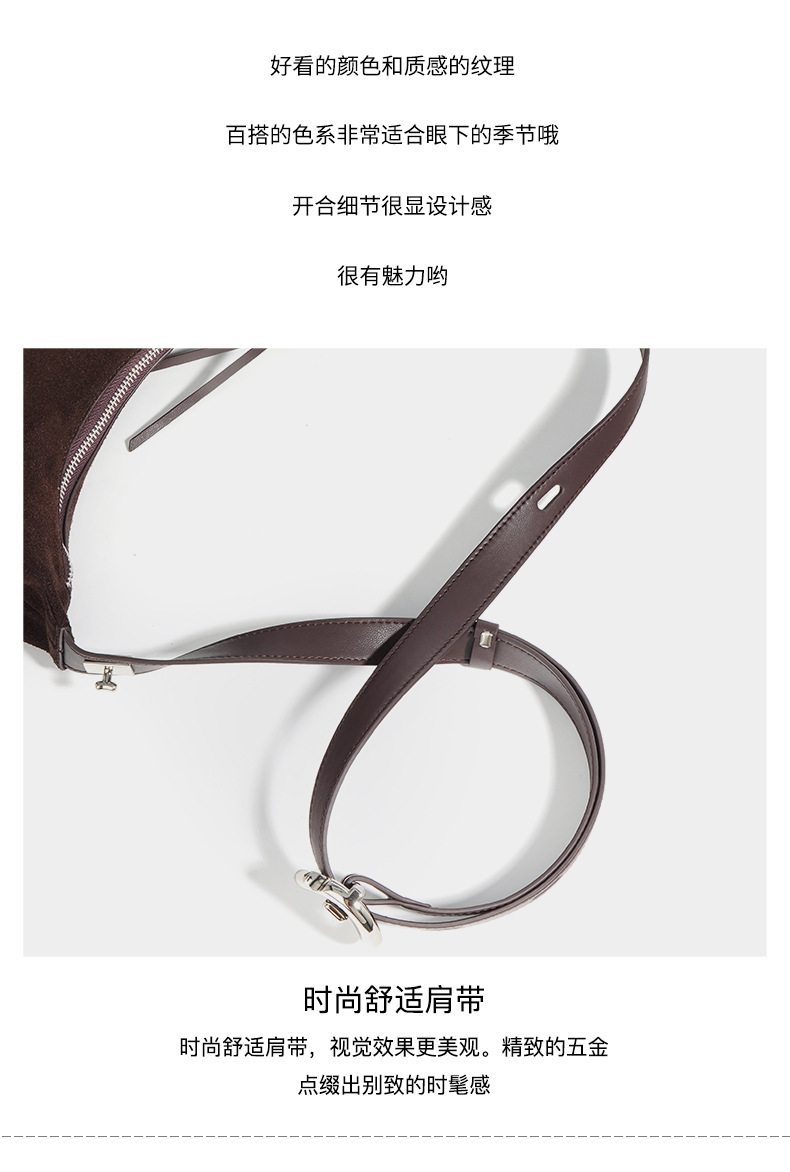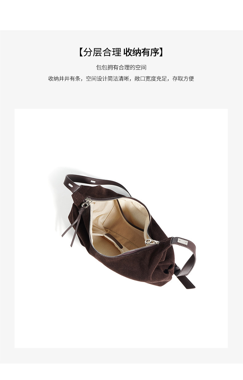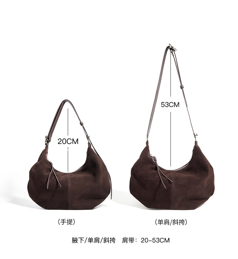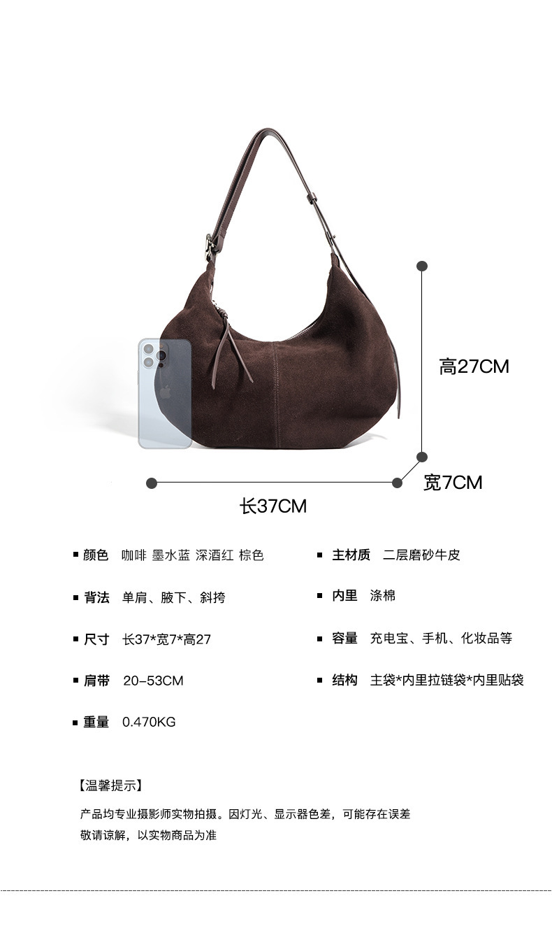 Casual suede shoulder bag blends refined texture with practical, everyday practicality. Crafted from a soft, second-layer matte cowhide and finished with a breathable cotton lining, this dumpling-shaped crossbody delivers structure without sacrificing lightness. Available in two versatile hues—ink blue and blueberry purple—you can switch styles to suit your mood or outfit with ease.