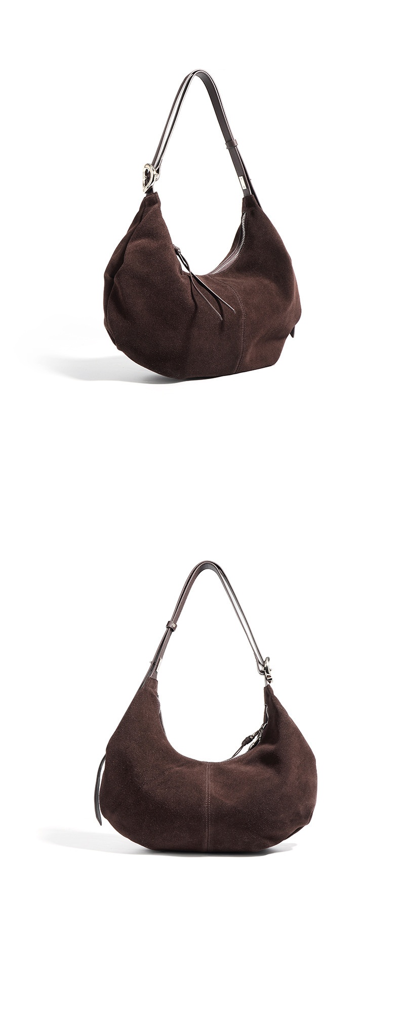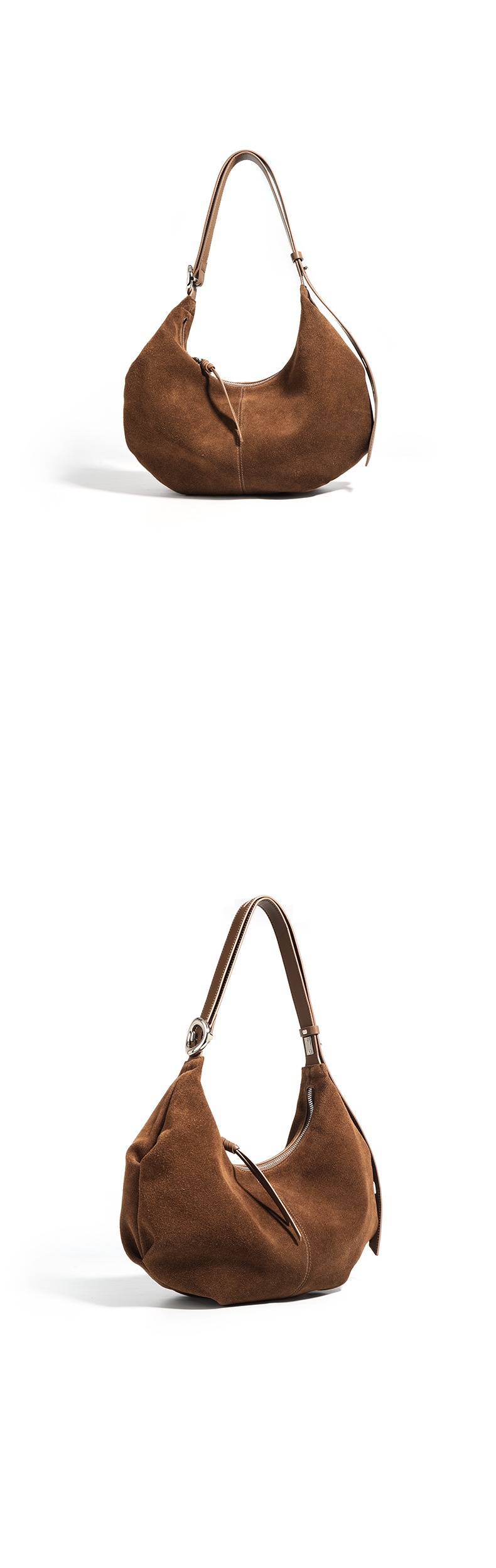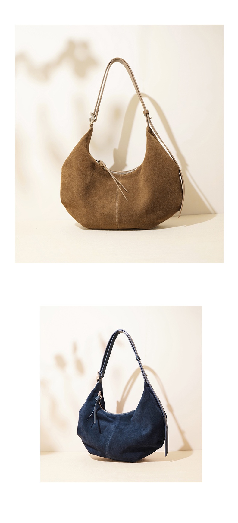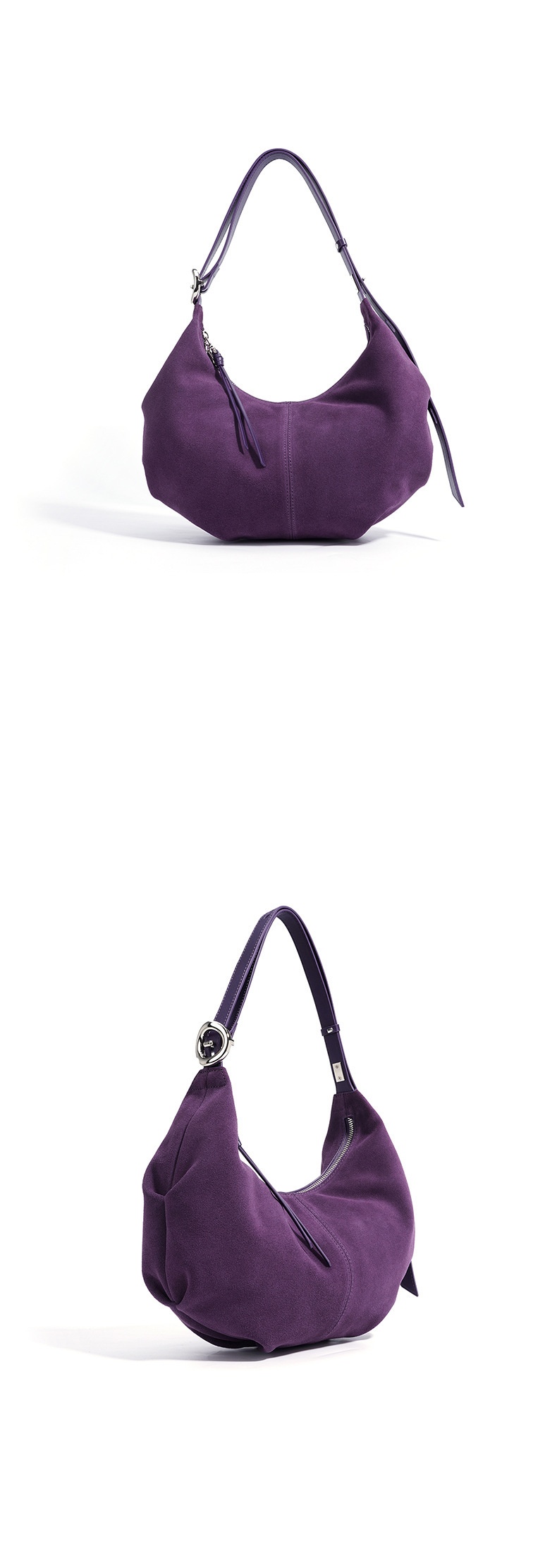 Casual suede shoulder bag blends refined texture with practical, everyday practicality. Crafted from a soft, second-layer matte cowhide and finished with a breathable cotton lining, this dumpling-shaped crossbody delivers structure without sacrificing lightness. Available in two versatile hues—ink blue and blueberry purple—you can switch styles to suit your mood or outfit with ease.
